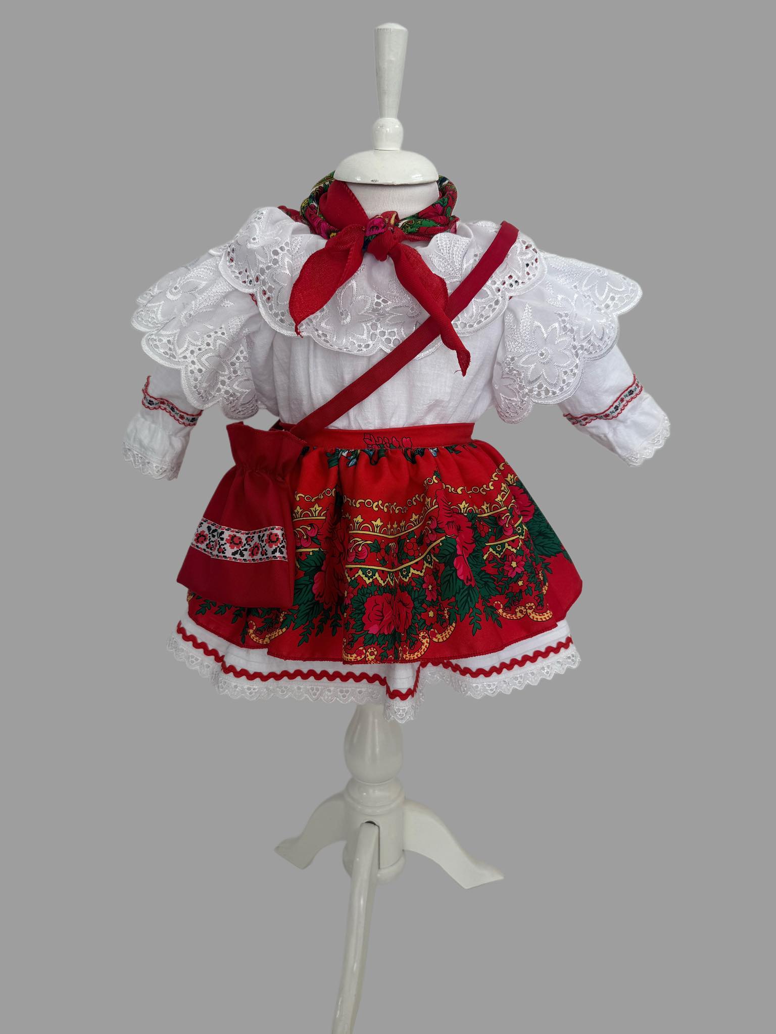 Rochița tradițională pentru fetițe este inspirată din portul popular românesc, confecționată manual cu grijă și pasiune. Setul conține o bluză albă brodată cu volane decorative, fustiță cu imprimeu floral bogat, batic asortat și poșetuță tradițională.